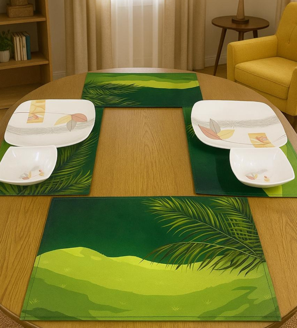 Bring a refreshing natural touch to your dining space with this Tropical Green Canvas Table Mat Set. Crafted from high-quality canvas material, these table mats feature a serene green landscape-inspired design that adds warmth and elegance to any table setting.